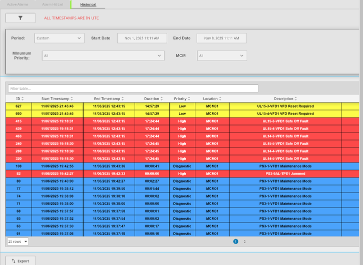fixes in the history alarm table, not showing the correct styles and colors. removed the footer from the alarms page